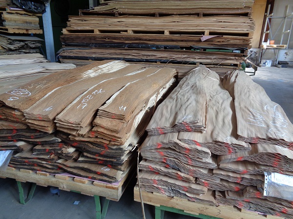 Neben den uns bekannteren Baumarten wie der Eiche, Buche oder dem Ahorn konnten wir auch zu Furnier verarbeitete Obstbäume, Eukalyptus sowie auch den Tulpenbaum bestaunen. Je nach „Trend“ und Kundenwunsch werden den Hölzern in einer Räucherkammer spezielle Farbnuancen verliehen. So entsteht beispielsweise die „Räuchereiche“. Ein schokobraunes bis fast schwarzes Furnier. Ganz hoch im Kurs ist momentan die „Trüffeleiche“, deren Hölzer werden für das Furnier mit diversen Pilzen modifiziert um die typische Marmorierung zu erlangen. Beeindruckend waren auch die Herstellungsverfahren der Messerfurniere, welche dann weltweit verkauft werden.